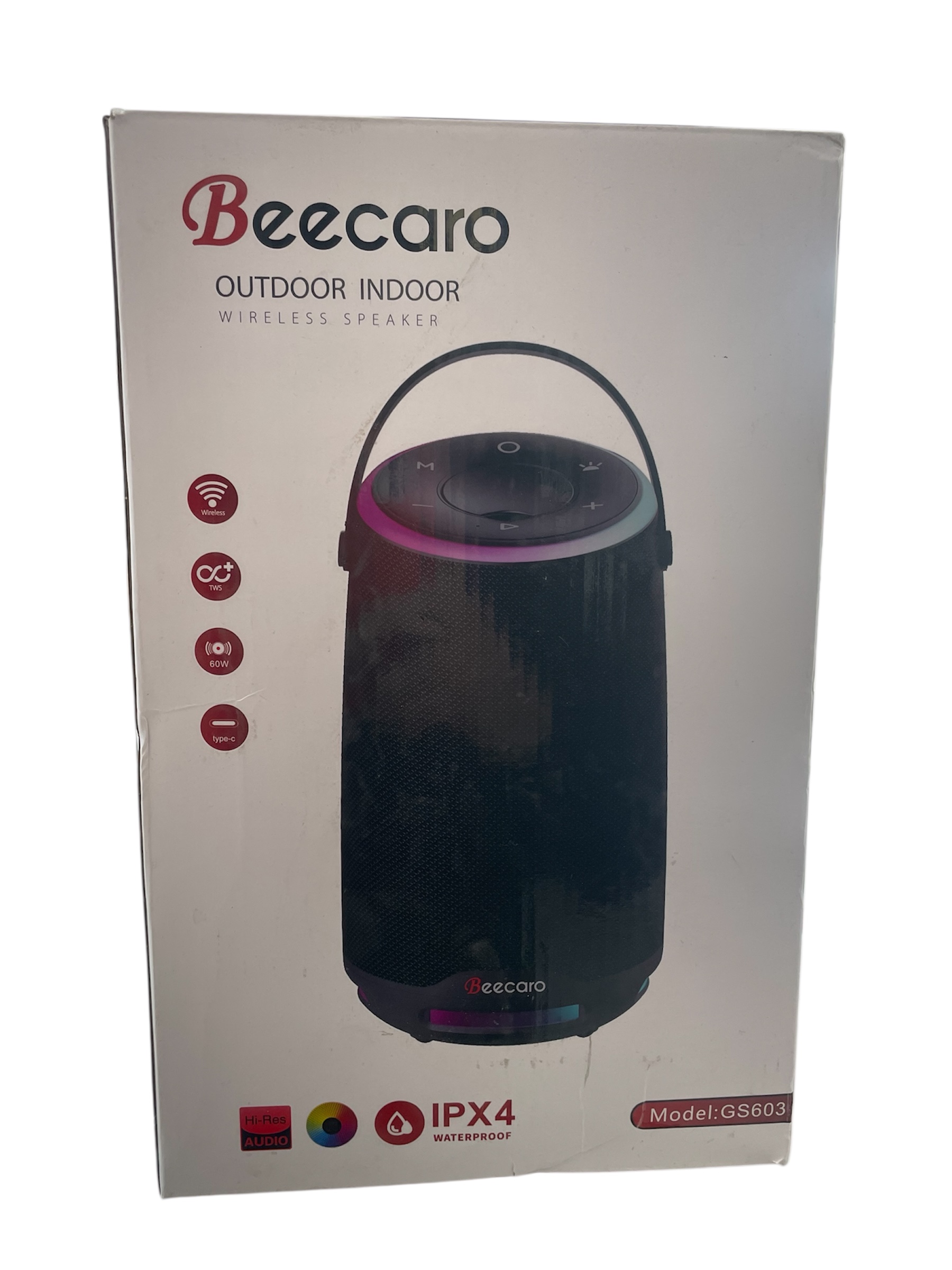 اسپیکر قابل حمل بیکارو دارای دسته با بند چرمی برای حمل راحتر رقص نور چند حالت توان خروجی ۱۲۰ وات درگاه شارژ تایپ سی نوع اتصال بلوتوث فلش AUX